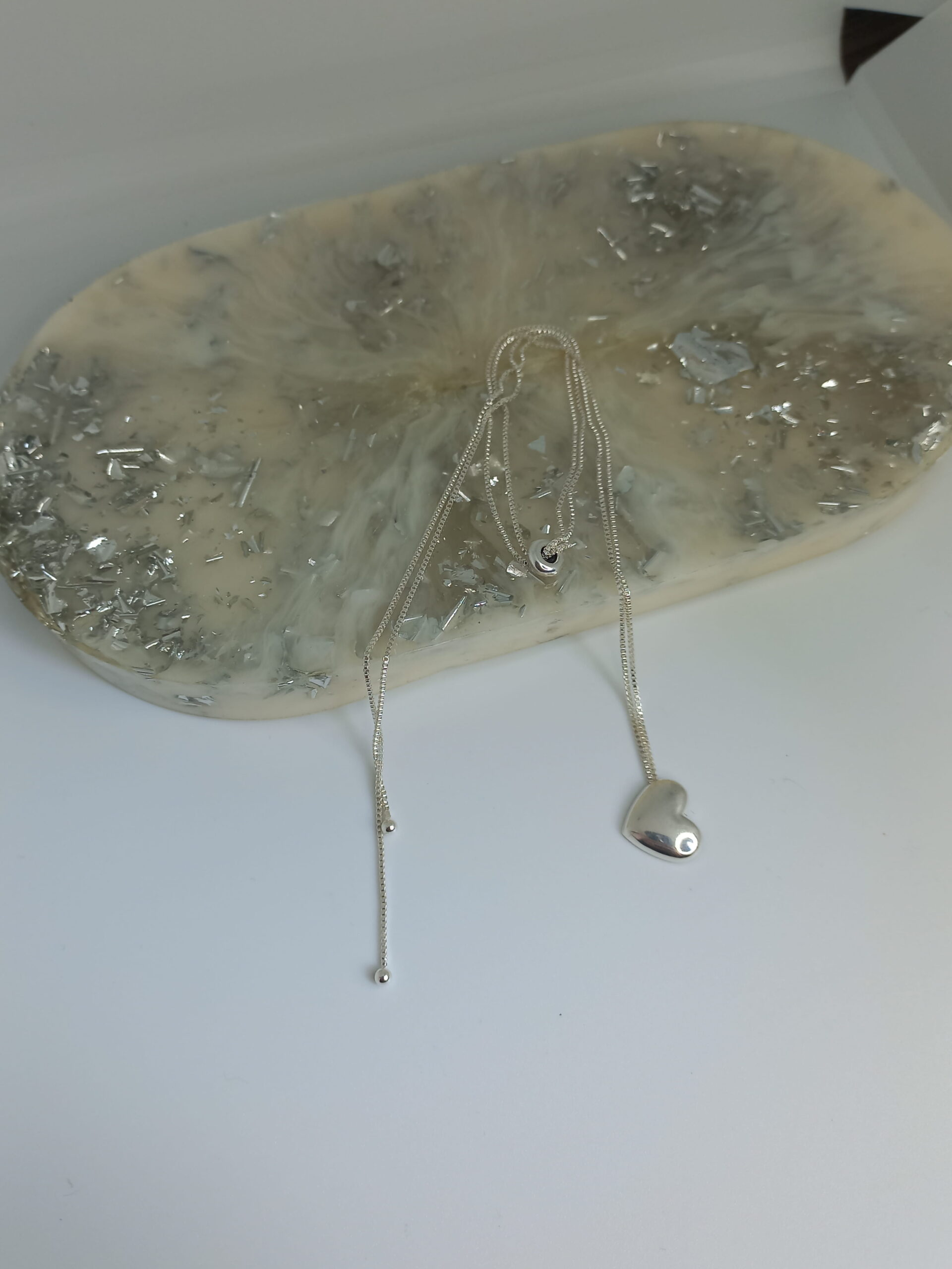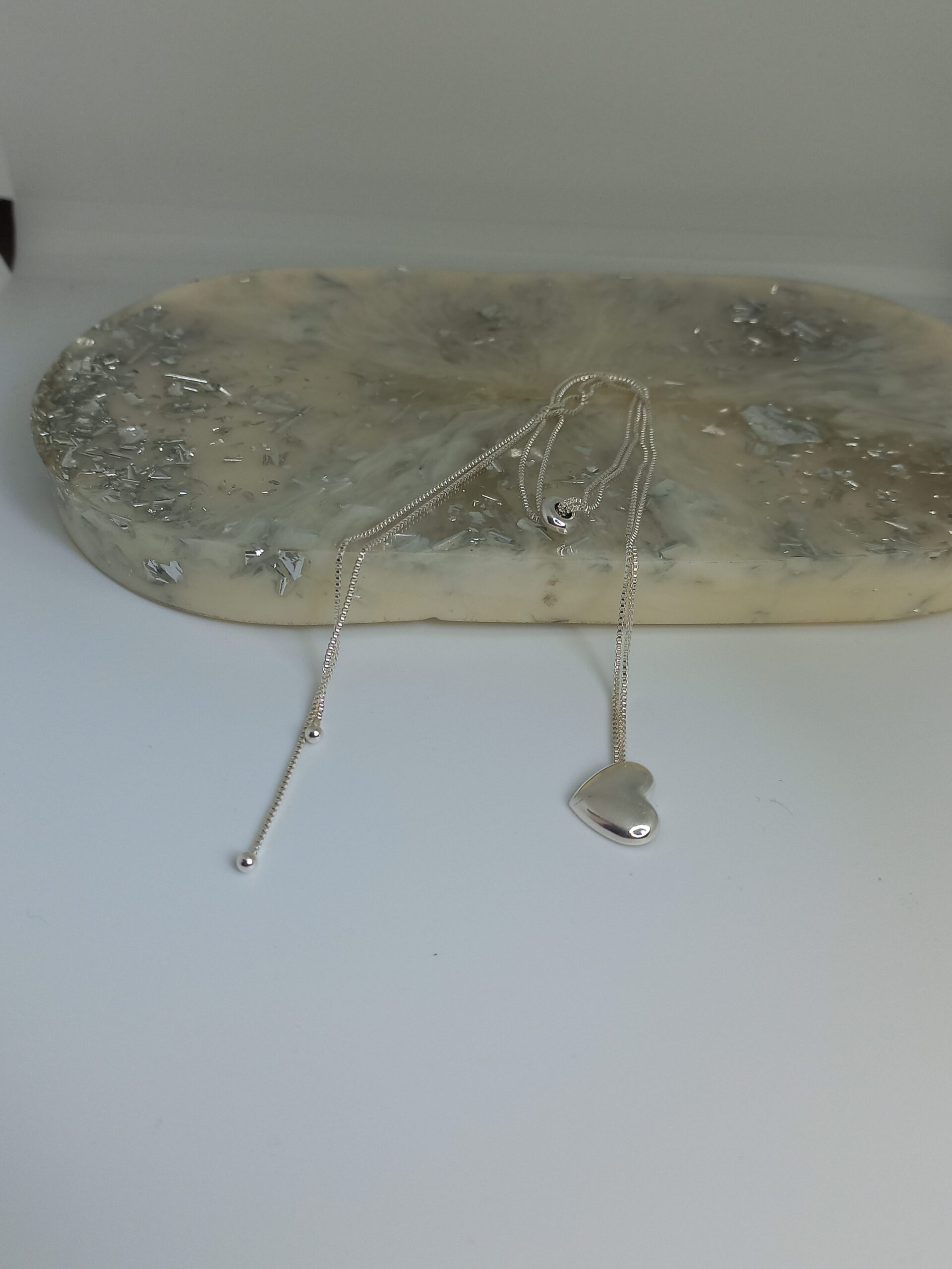 Corrente de ajuste no meio, banhada a prata com coração chapado.