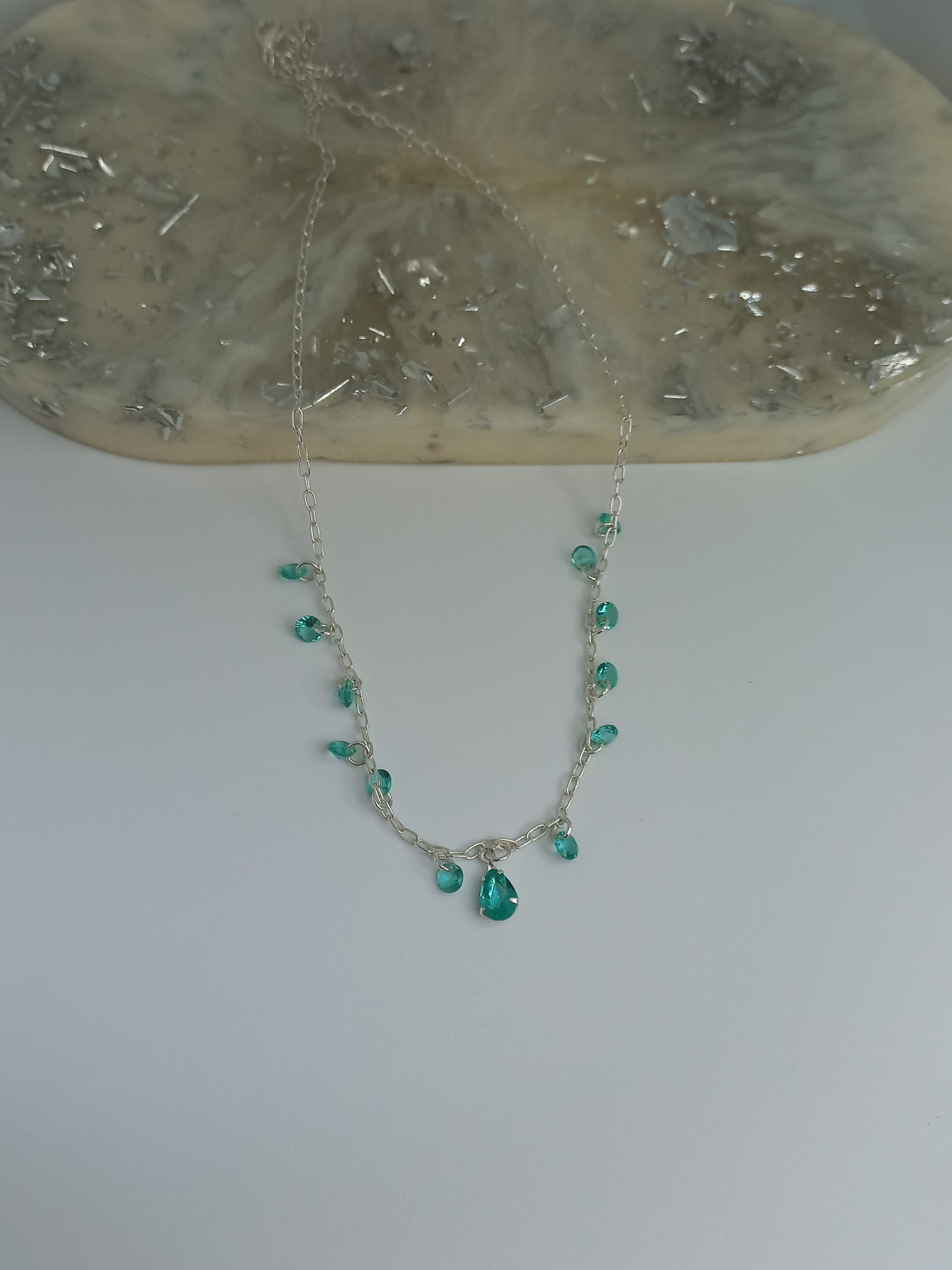 Corrente banhada a prata com 12 pedras verde agua.