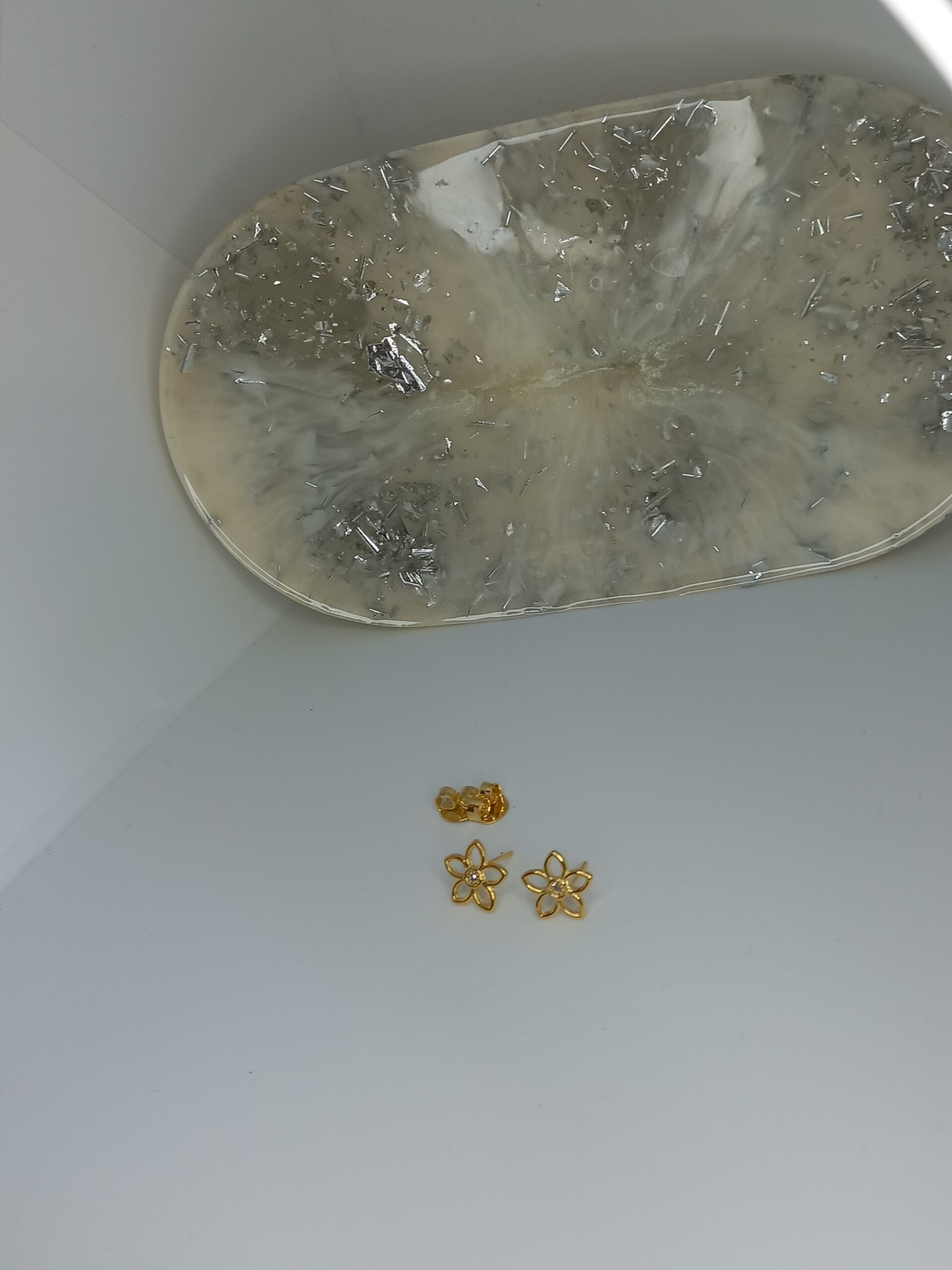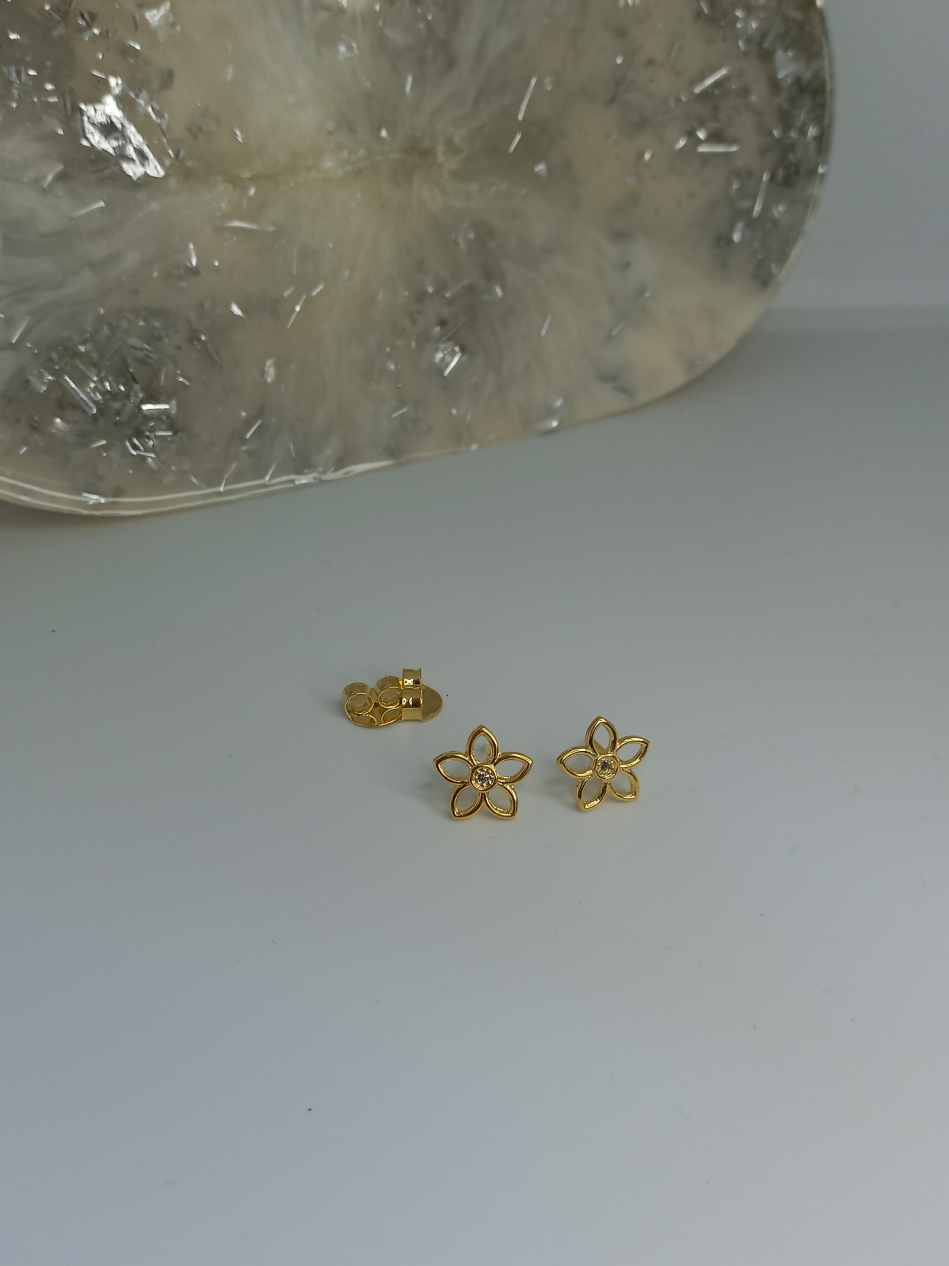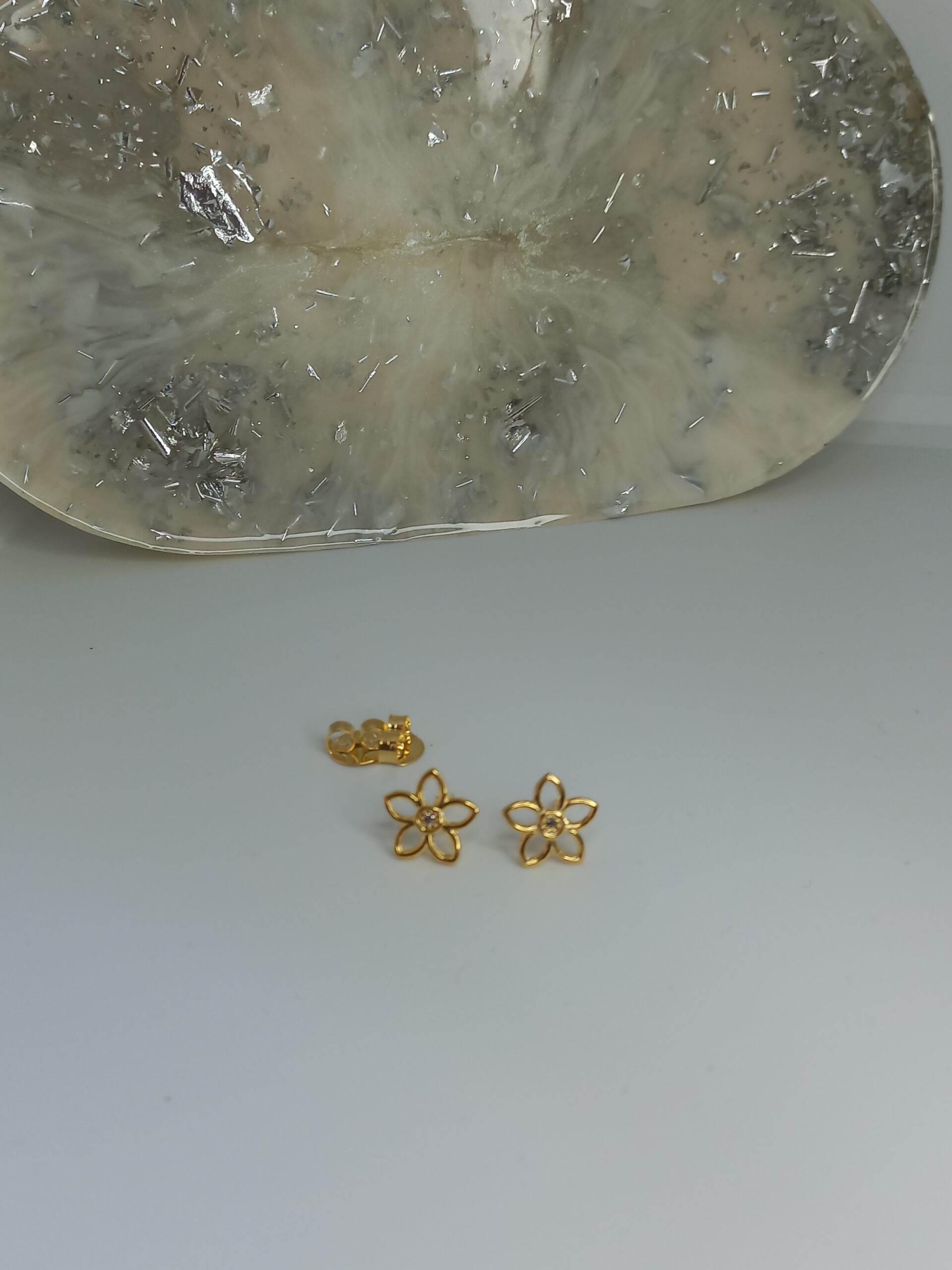 Brinco de 5 pétalas vazadas com zircônia no centro.