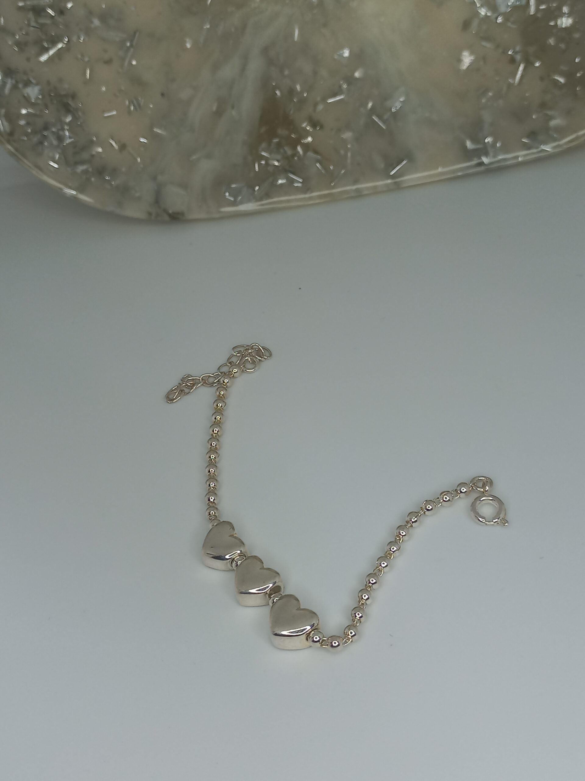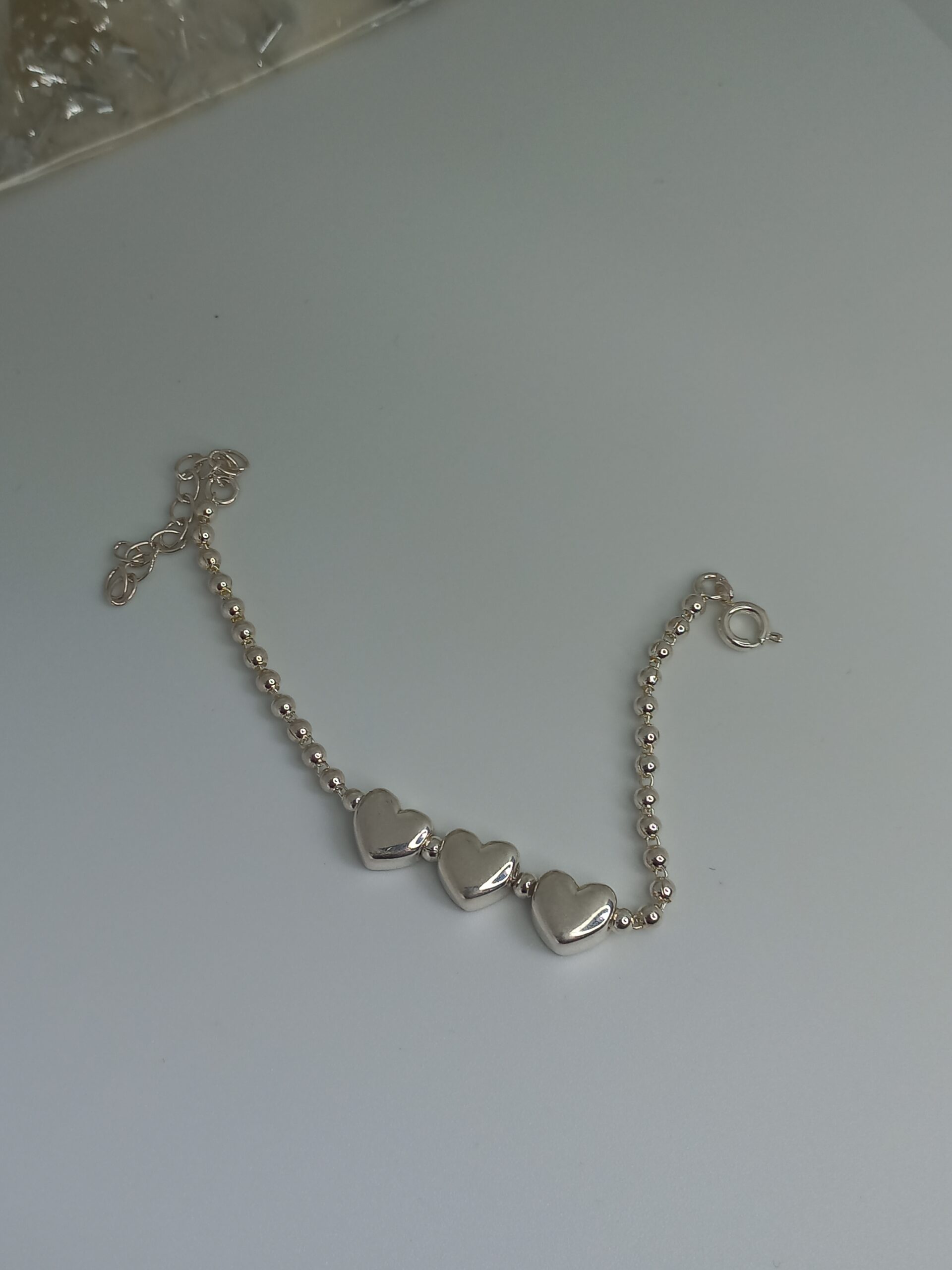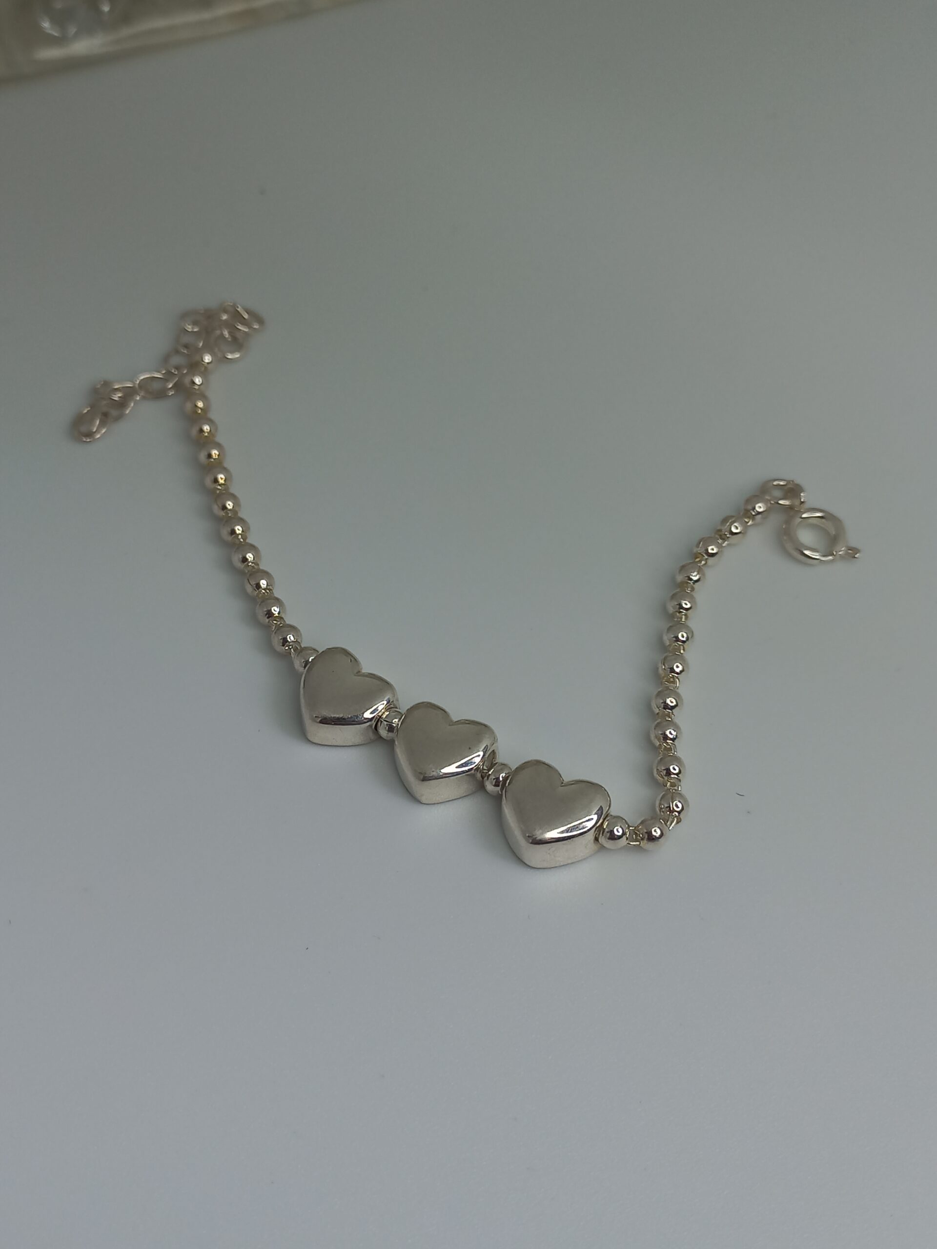 Pulseira com três corações e bolinhas banhada a prata.