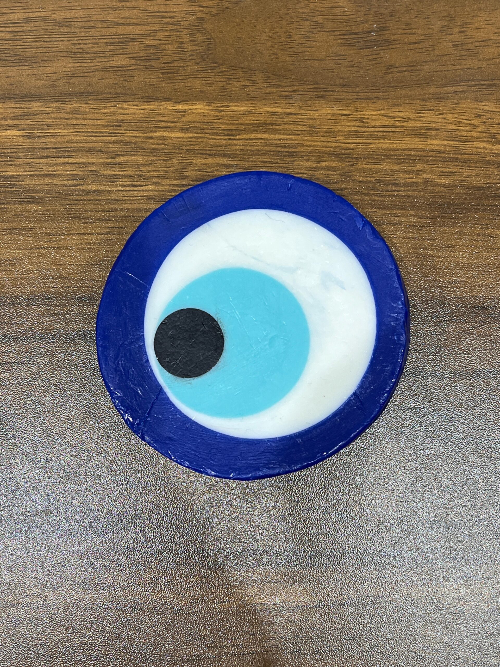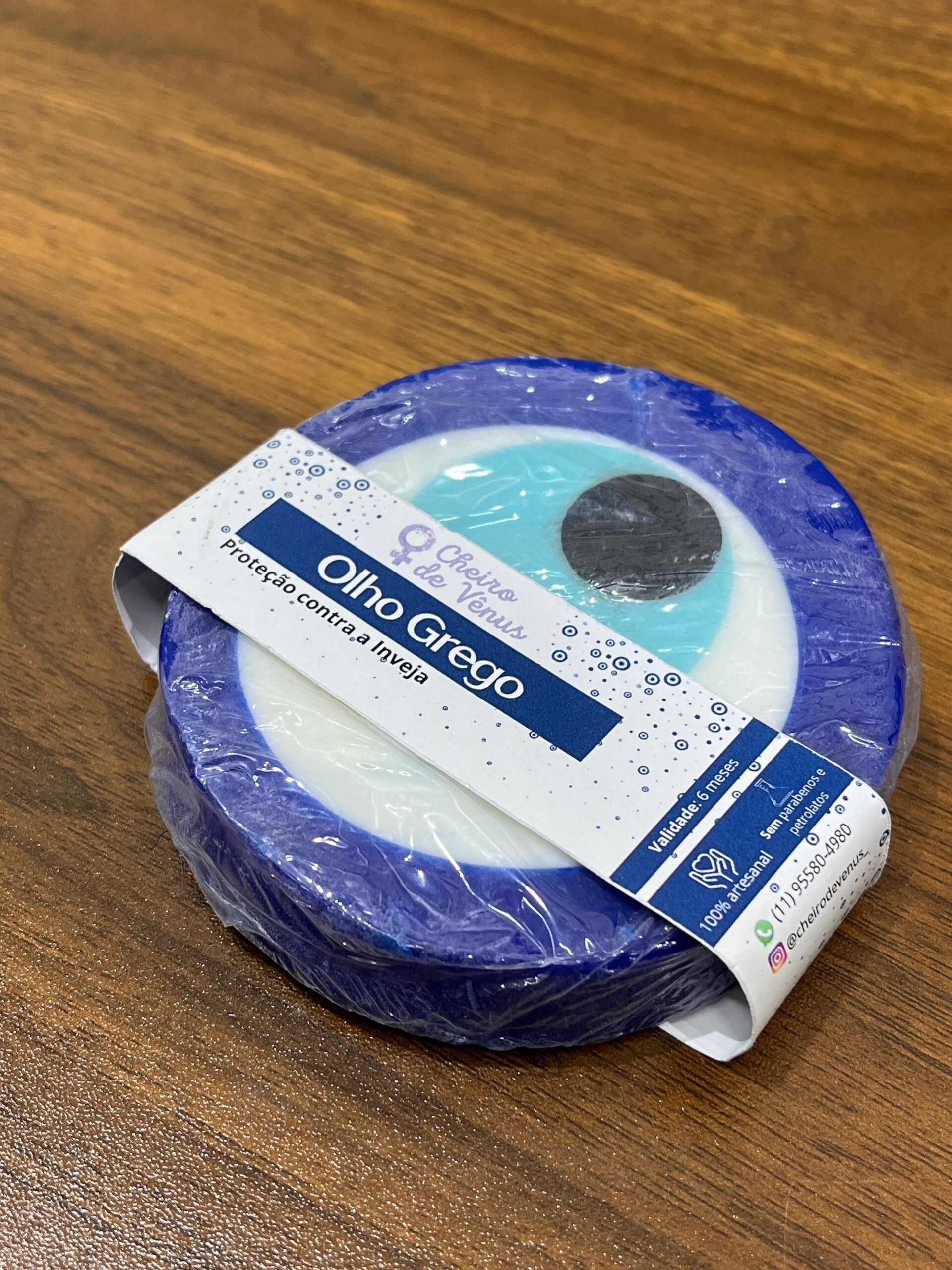 Sabonete de olho grego feito com glicerina, corante azul escuro, azul claro e essência, sem parabenos.