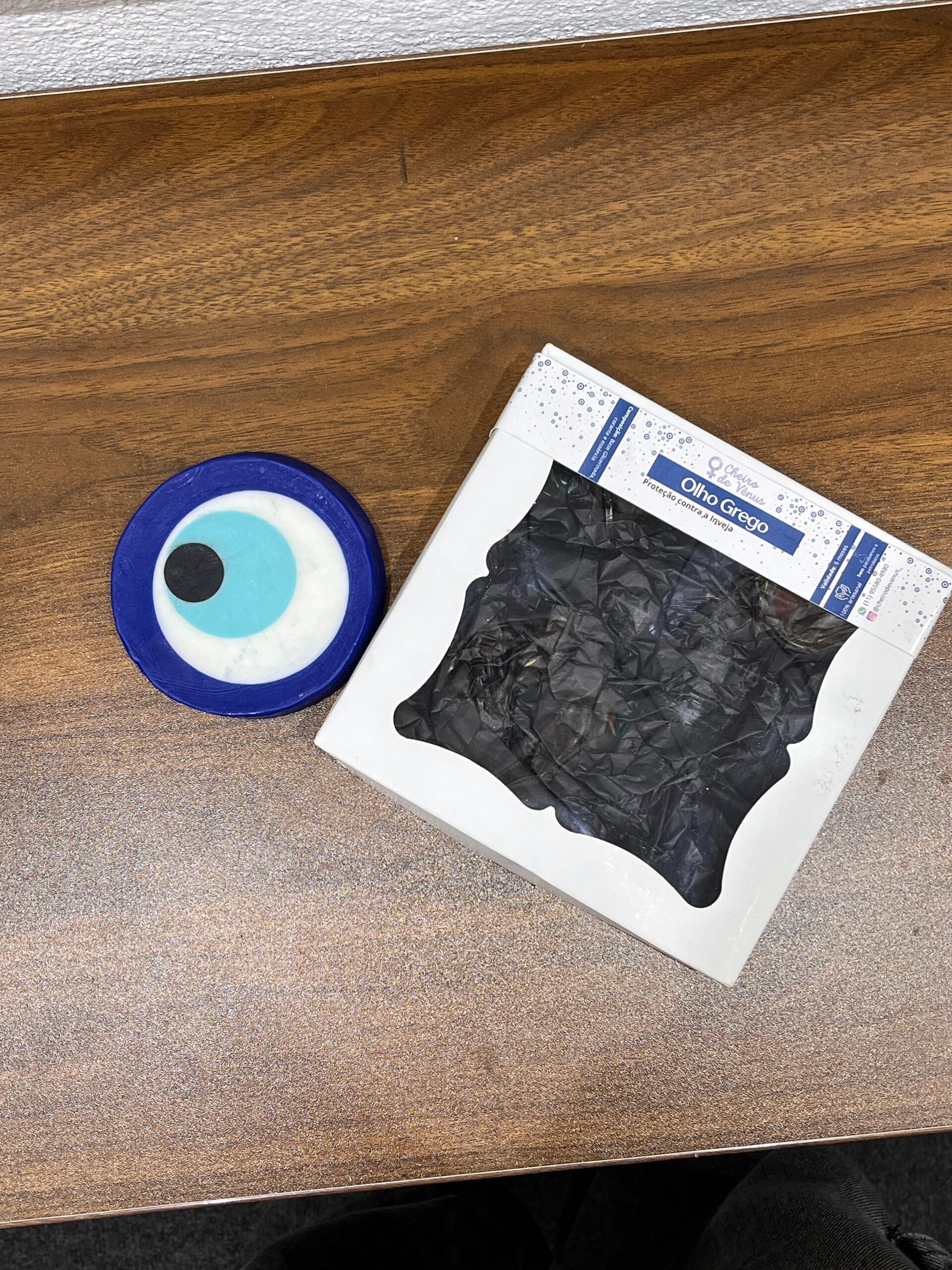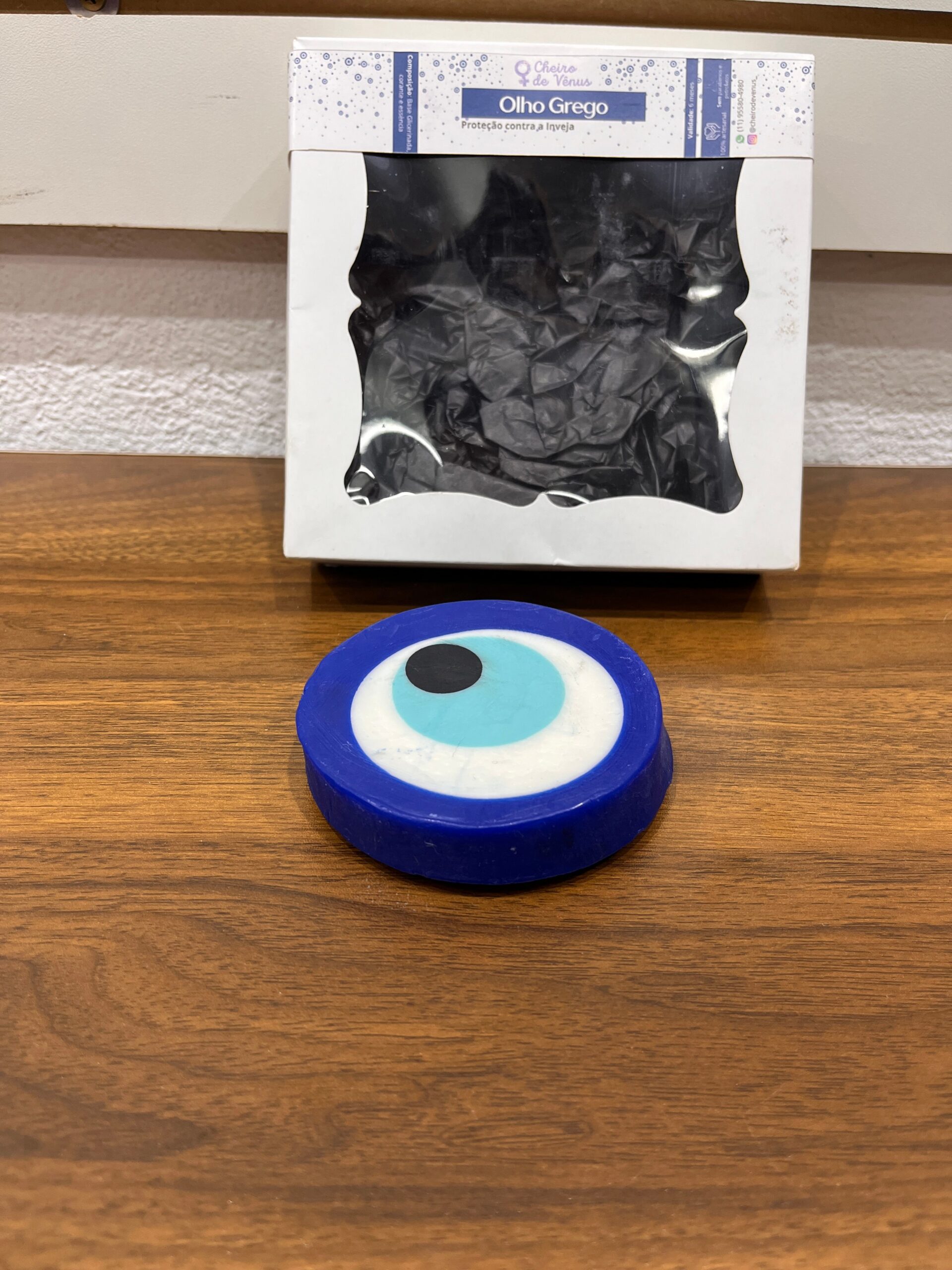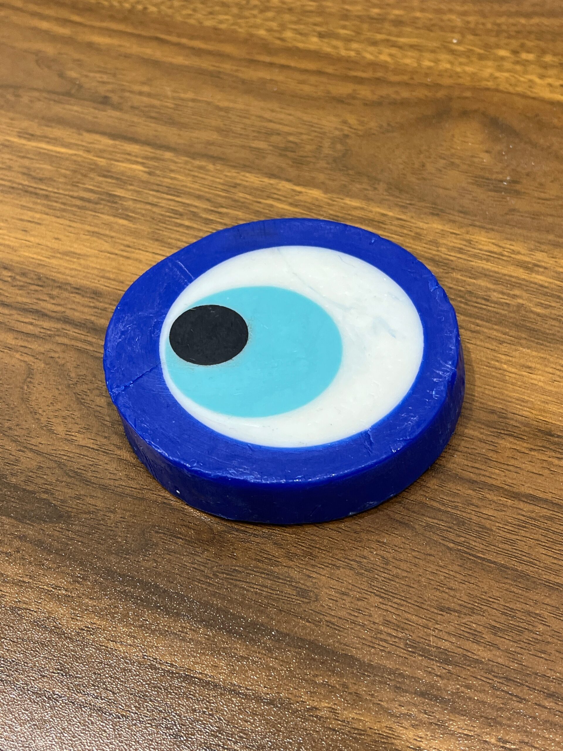 Sabonete de olho grego feito com glicerina, corante azul escuro, azul claro e essência, sem parabenos.